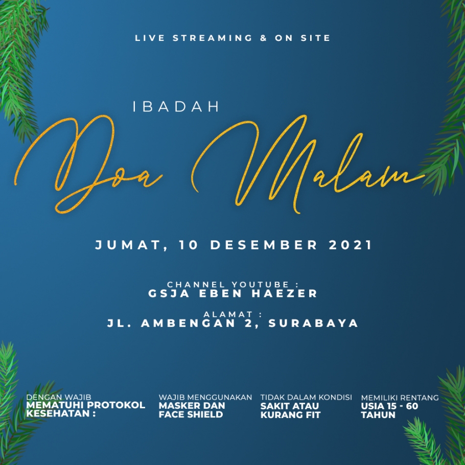 Ibadah doa malam akan diadakan pada hari jumat, 10 Desember 2021 pukul 19.00 WIB.