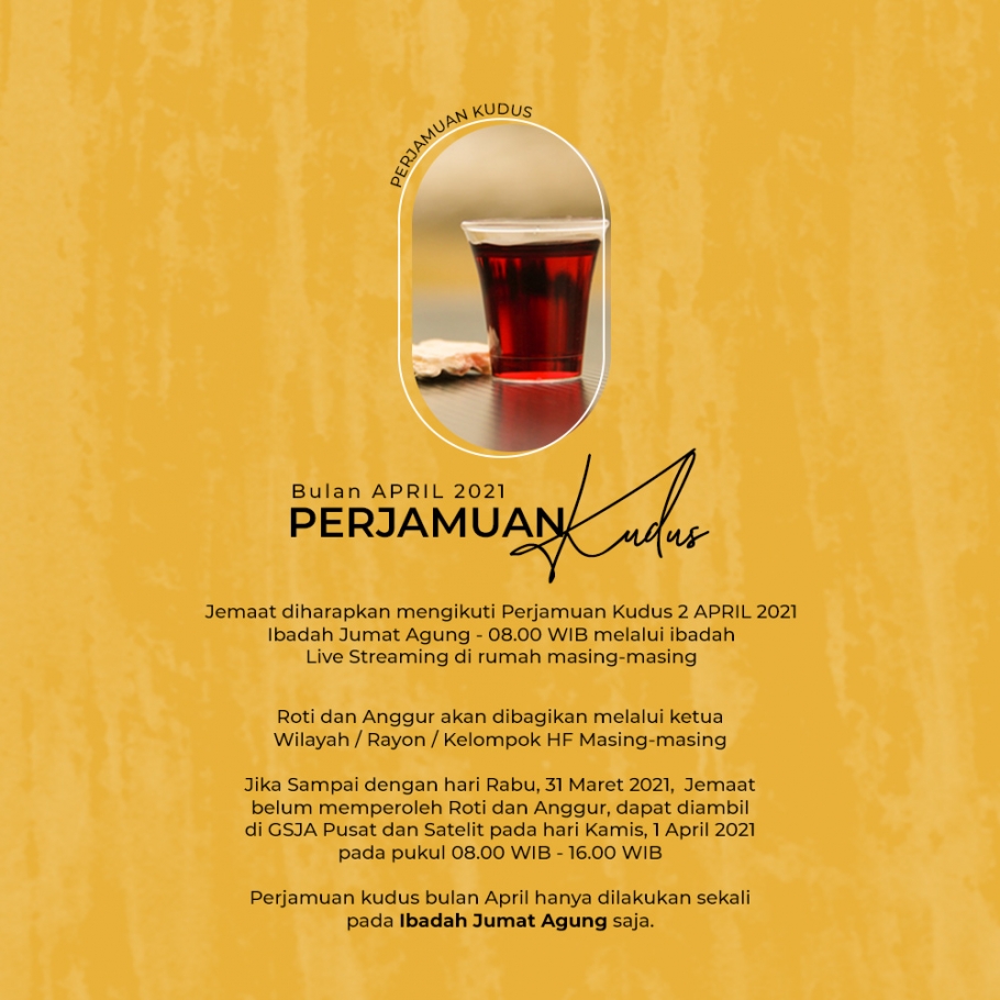 Roti dan Anggur akan dibagikan melalui ketua Wilayah / Rayon / Kelompok HF Masing-masing Jika Sampai dengan hari Rabu, 31 Maret 2021, Jemaat belum memperoleh Roti dan Anggur, dapat diambil di GSJA Pusat dan Satelit pada hari Kamis, 1 April 2021 pada pukul 08.00 WIB - 16.00 WIB Perjamuan kudus bulan April hanya dilakukan sekali pada Ibadah Jumat Agung saja.