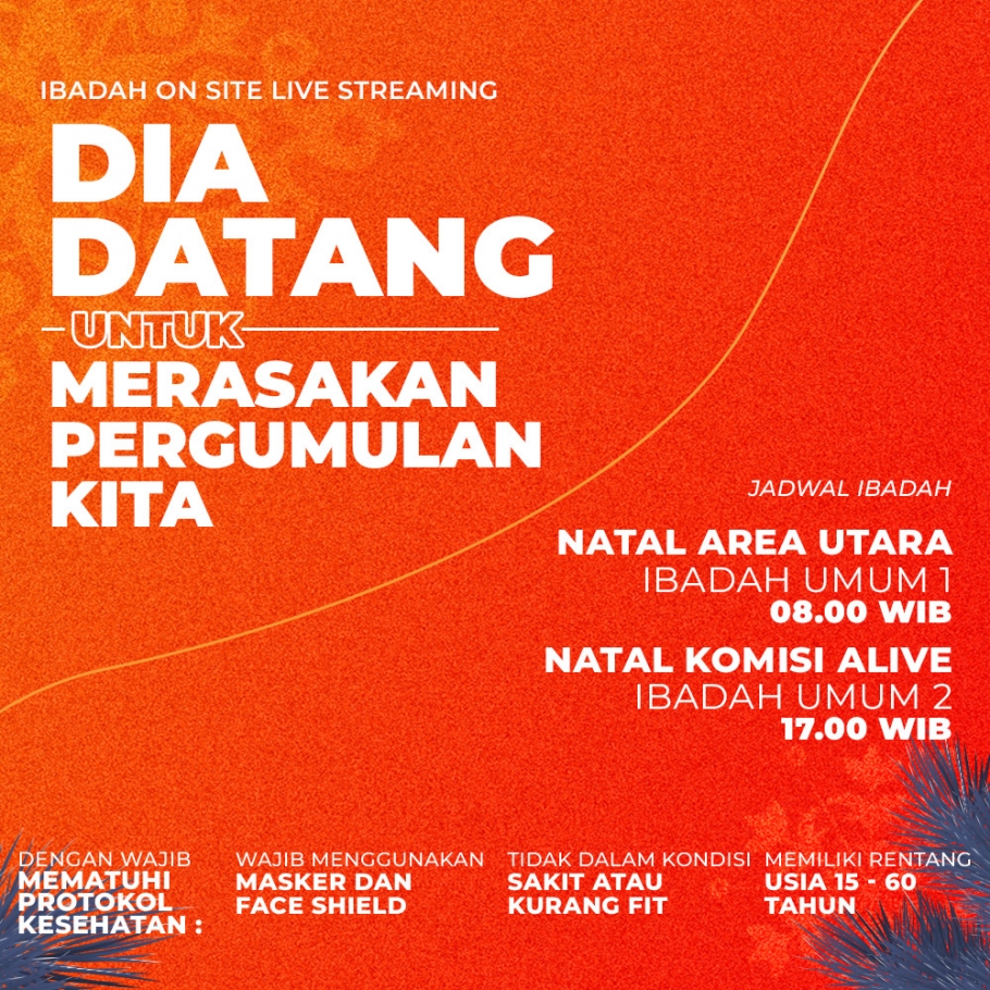 Untuk Natal Komisi Alive dapat di iikuti pada ibadah pukul 17,00 WIB. Ibadah ini juga akan diadakan secara On Site dan Live Streaming. Untuk Ibadah On Site, dapat mendaftarkan diri terlebih dulu pada aplikasi lenggah atau website lenggah. Dan untuk Live Streaming dapat di akses pada Channel Youtube - GSJA Eben Haezer.